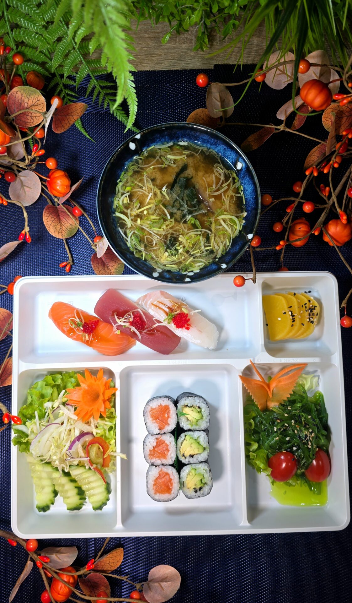 𝗭𝗲𝘀𝘁𝗮𝘄 𝗦𝘂𝘀𝗵𝗶, obejmujący m.in. zupę miso, nigiri z łososia, tuńczyka i dorady, maki z łososiem i awokado oraz sałatkę wakame.