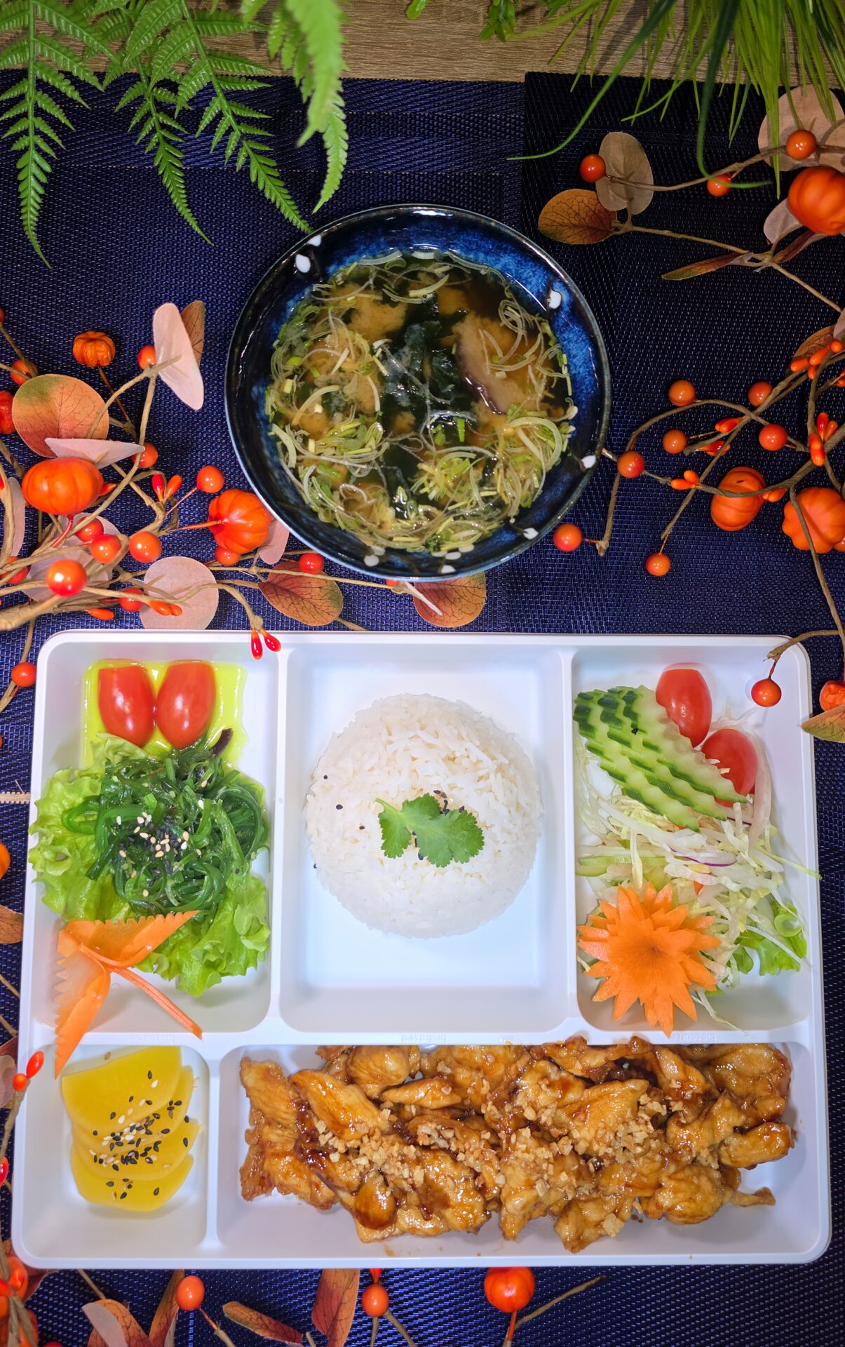 𝗭𝗲𝘀𝘁𝗮𝘄 𝗞𝘂𝗿𝗰𝘇𝗮𝗸 𝗧𝗲𝗿𝗶𝘆𝗮𝗸𝗶, w skład którego wchodzą zupa miso, kurczak w sosie teriyaki, ryż jaśminowy oraz dodatki sałat.