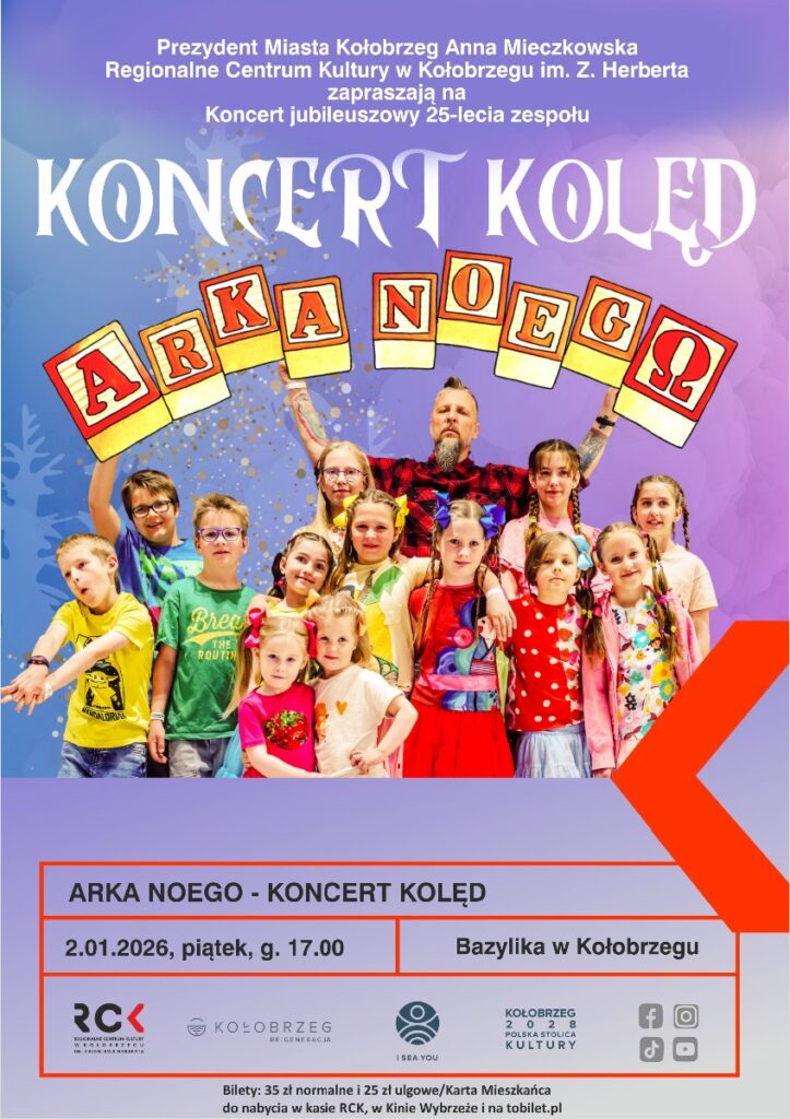 Prezydent Miasta Kołobrzeg Anna Mieczkowska oraz Regionalne Centrum Kultury im. Zbigniewa Herberta zapraszają mieszkańców i gości na wyjątkowy, świąteczno-noworoczny koncert kolęd w wykonaniu zespołu Arka Noego. Wydarzenie odbędzie się w szczególnym roku – jubileuszu 25-lecia istnienia zespołu, który od pokoleń towarzyszy polskim rodzinom swoją radością i muzyką pełną ciepła. Arka Noego to jeden z najbardziej […]