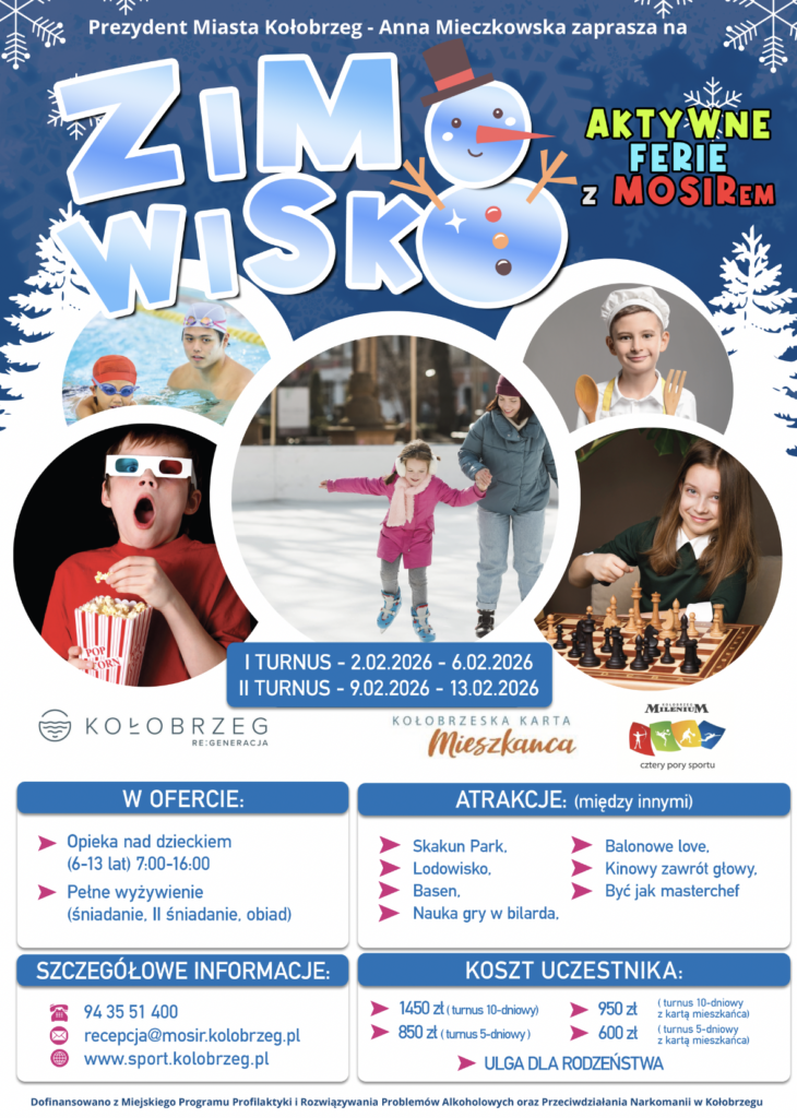 Ferie zimowe to czas odpoczynku, zabawy i niezapomnianych wspomnień. Zadbaj o to, aby Twoje dziecko spędziło je aktywnie, bezpiecznie i kreatywnie! MOSiR Kołobrzeg zaprasza dzieci w wieku 6–13 lat na wyjątkowe Zimowisko 2026, pełne sportowych emocji, zabawy i nowych przyjaźni Terminy do wyboru: I turnus: 2–6 lutego 2026 II turnus: 9–13 lutego 2026 Co zapewniamy? […]