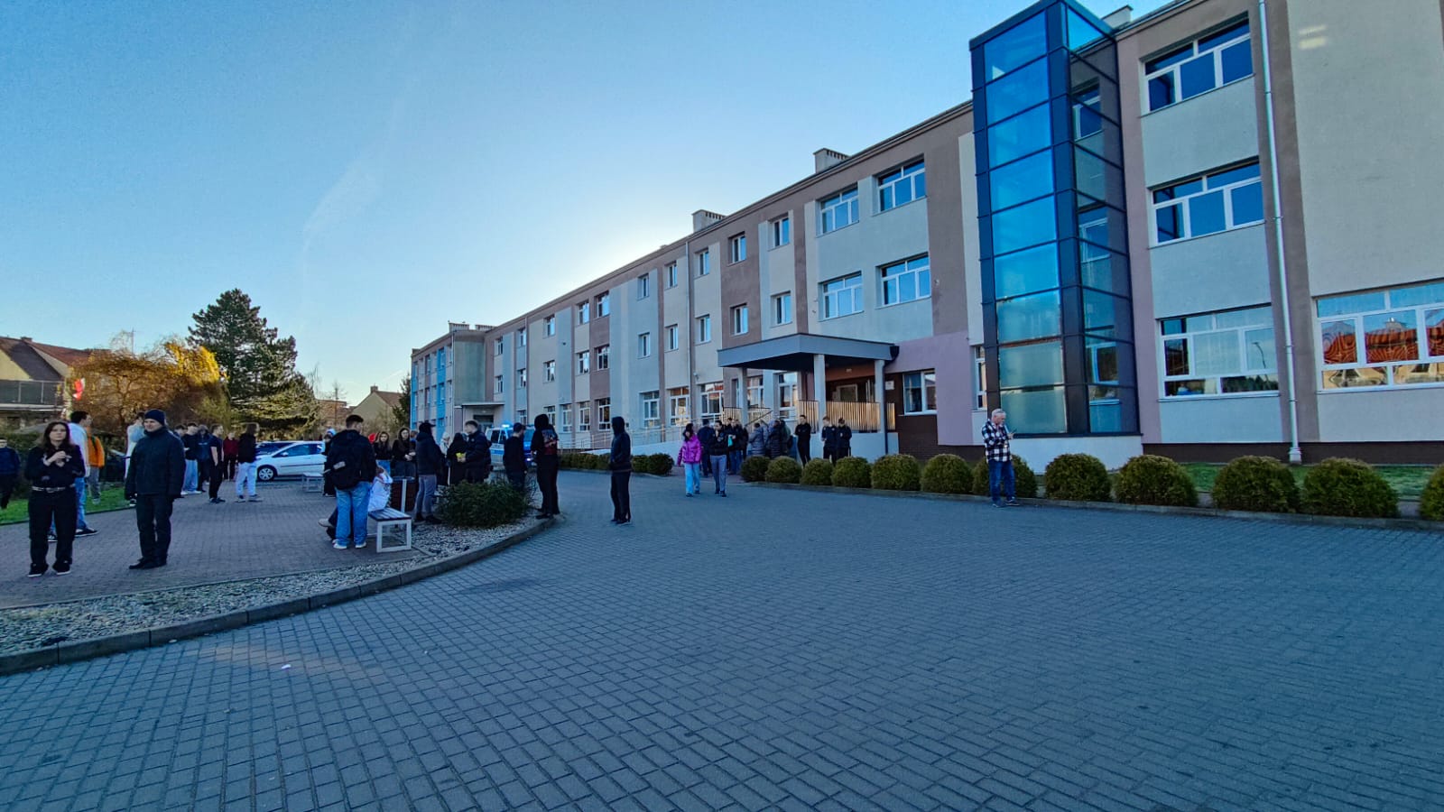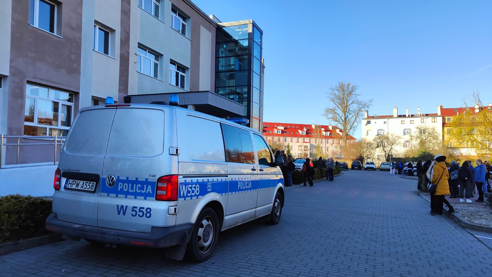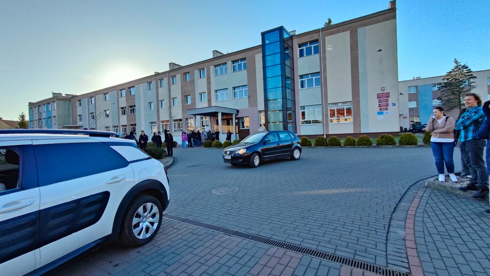 Od razu w kołobrzeskich szkołach usłyszano sygnał alarmowy w postaci trzech dzwonków. Kadra zarządziła natychmiastową ewakuację uczniów. Młodzież opuściła budynki i została zgrupowana przed szkołą. Miejscowi uczniowie mogli udać się do domów, a przyjezdni otrzymali schronienie przed zimnem. Z „Sienkiewicza” udali się do budynku OPP na ul. Mazowieckiej, a na ulicę Piastowską podstawiono autobus. Na miejscu pracuje policja. W obu placówka zajęcia zostały odwołane.