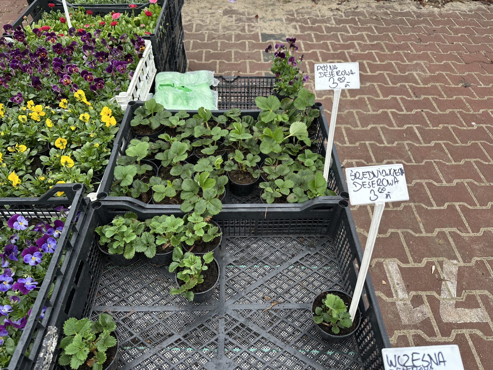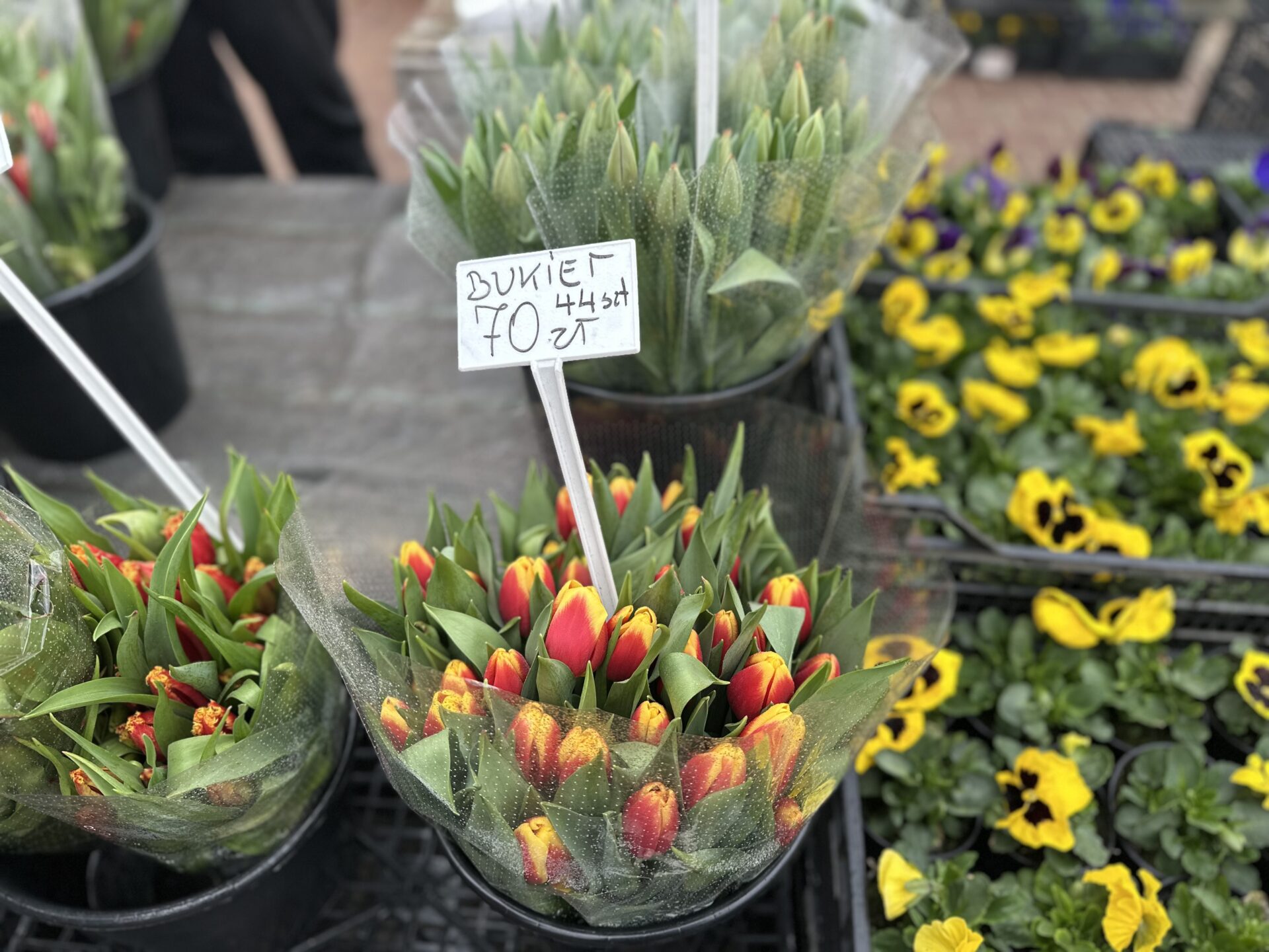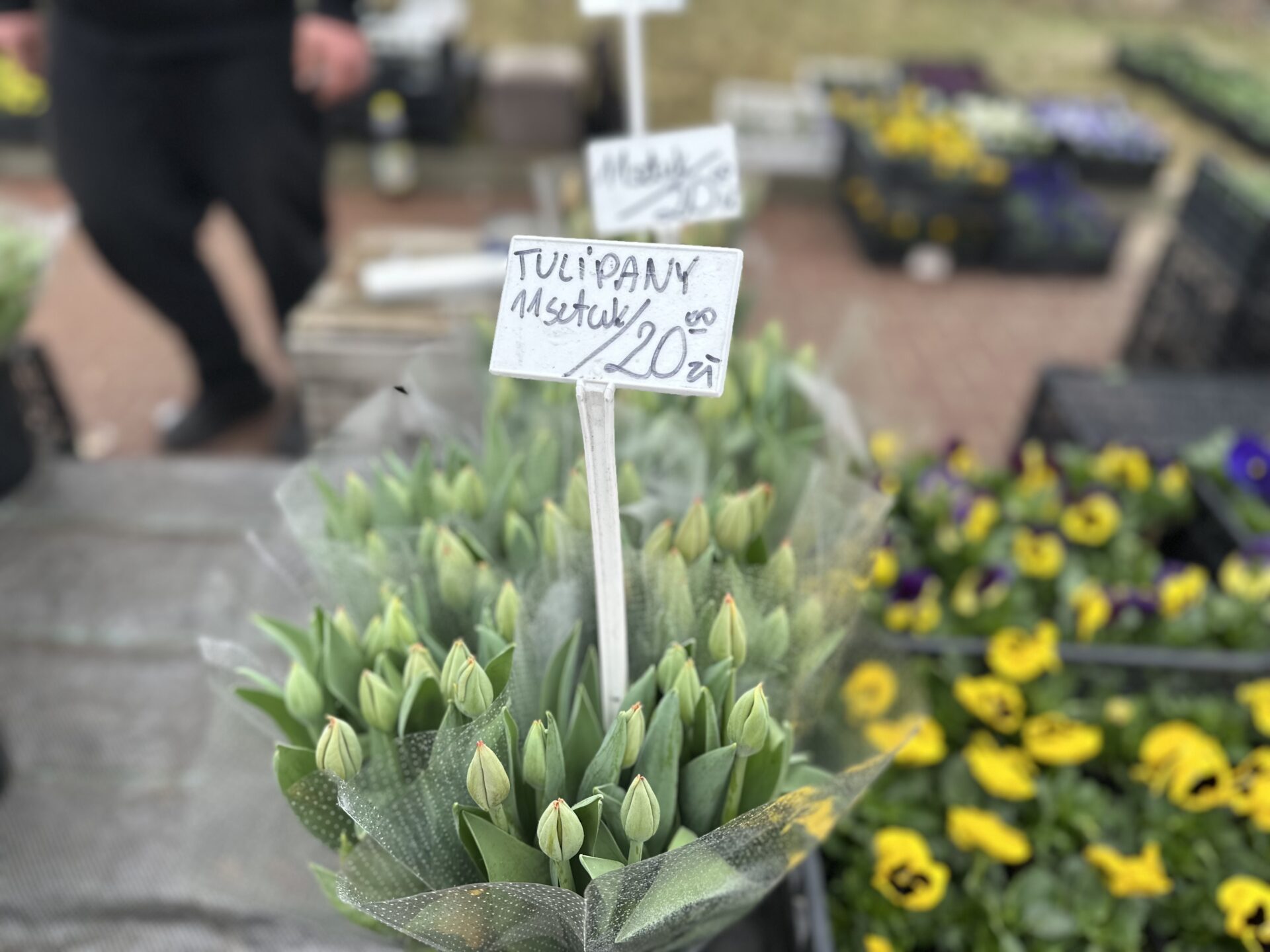 Wiosenny charakter targowiska podkreślają także kwiaty. Wśród nich królują przede wszystkim bratki i tulipany, które pojawiają się niemal na każdym stoisku ogrodniczym. Intensywne kolory kwiatów dodają miejscu energii i sprawiają, że spacer między straganami staje się jeszcze przyjemniejszy.