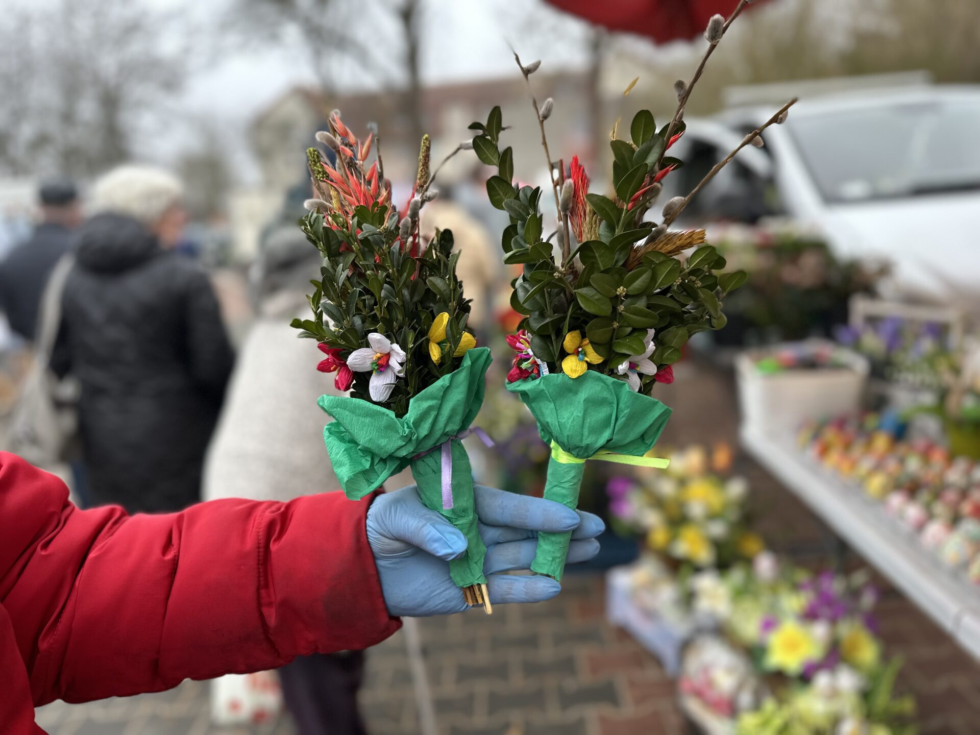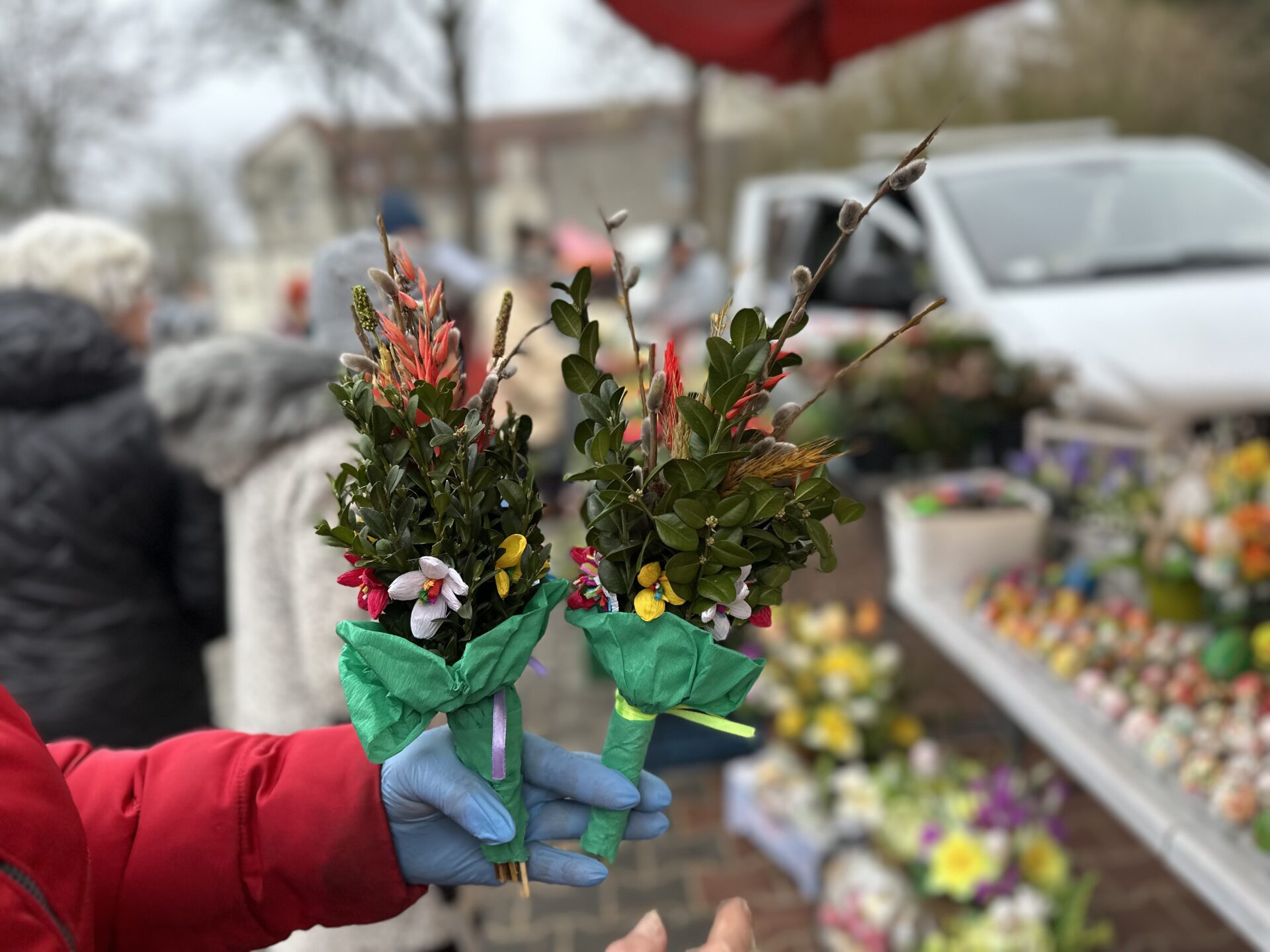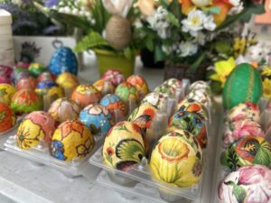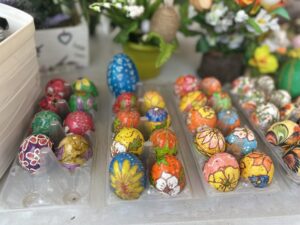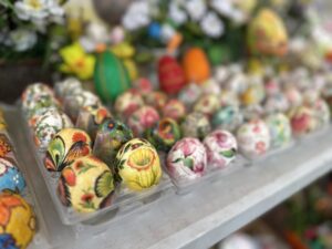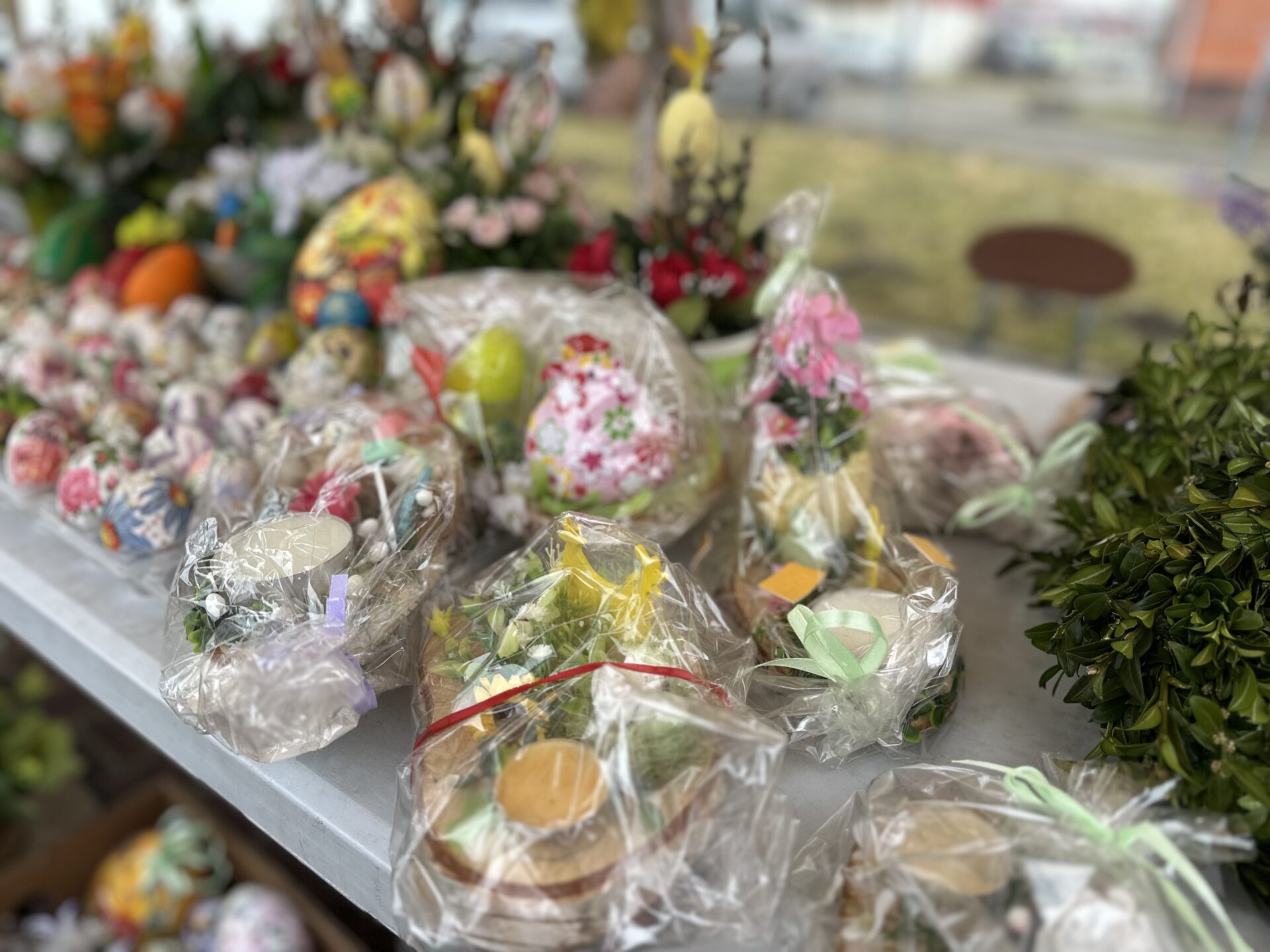 Na straganach nie brakuje ręcznie wykonanych dekoracji. Kolorowe palmy wielkanocne, misternie zdobione pisanki czy wiosenne wianki pokazują, jak dużo serca lokalni twórcy wkładają w swoje wyroby. Wiele z nich to prawdziwe małe dzieła sztuki – wykonane z naturalnych materiałów, pełne barw i tradycyjnych motywów.