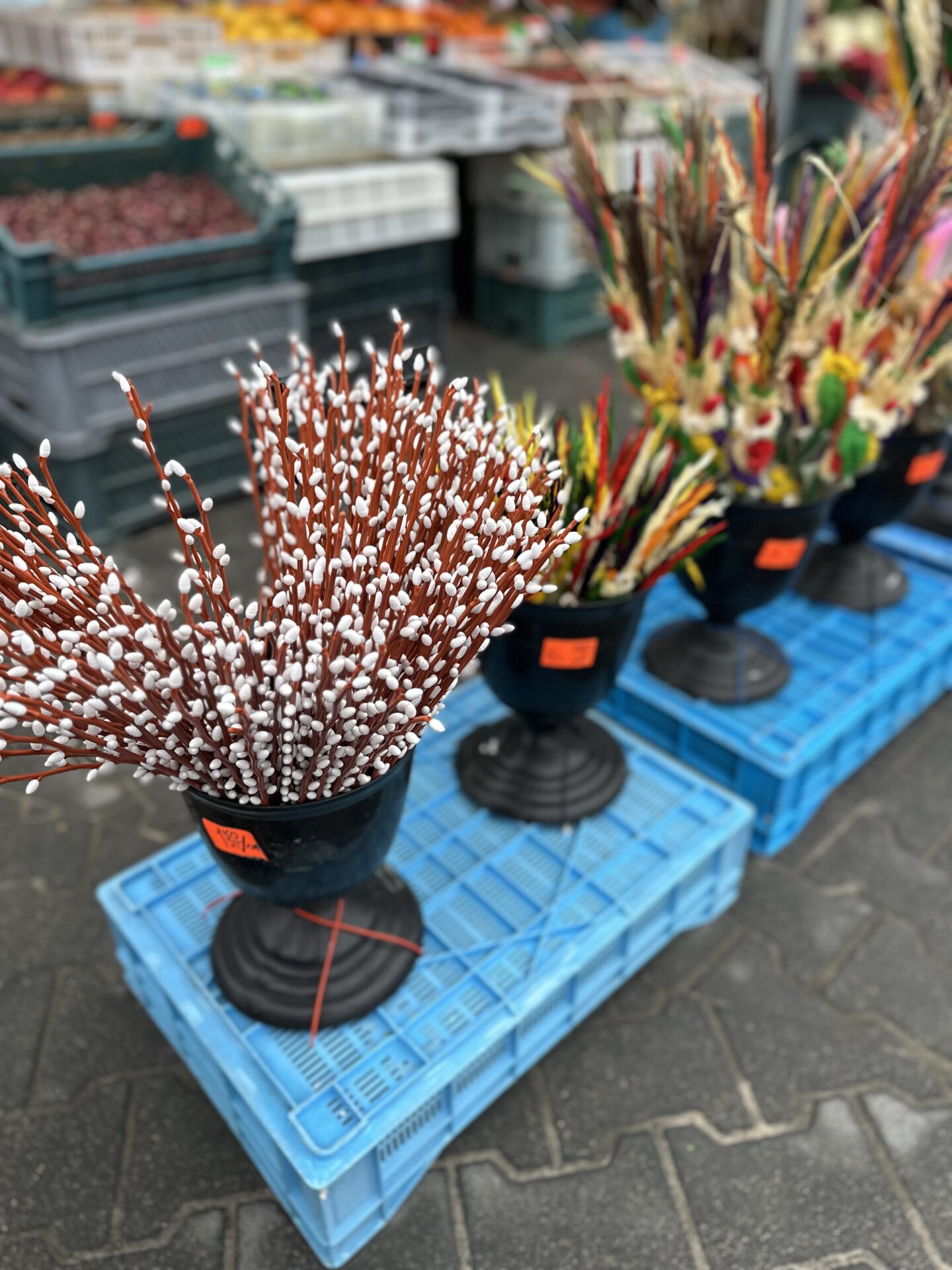 Wraz z nadejściem wiosny na miejskim targowisku w Kołobrzegu coraz wyraźniej czuć atmosferę zbliżających się świąt. Podczas naszej dzisiejszej wizyty można było zauważyć, że wśród stoisk pojawia się już wiele wielkanocnych akcentów, które przyciągają wzrok przechodniów i wprowadzają w prawdziwie świąteczny nastrój.
