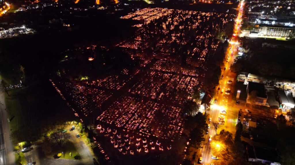 1 listopada obchodzimy Uroczystość Wszystkich Świętych. Tego dnia mieszkańcy Kołobrzegu i okolic odwiedzają groby bliskich, zapalają znicze i wspominają zmarłych. Zdjęcia z drona ukazują kołobrzeski cmentarz nocą – rozświetlony tysiącami świateł, będących symbolem pamięci i szacunku. To chwila refleksji nad przemijaniem oraz znaczeniem tradycji, która łączy pokolenia. fot. Jakub Dziędziura