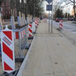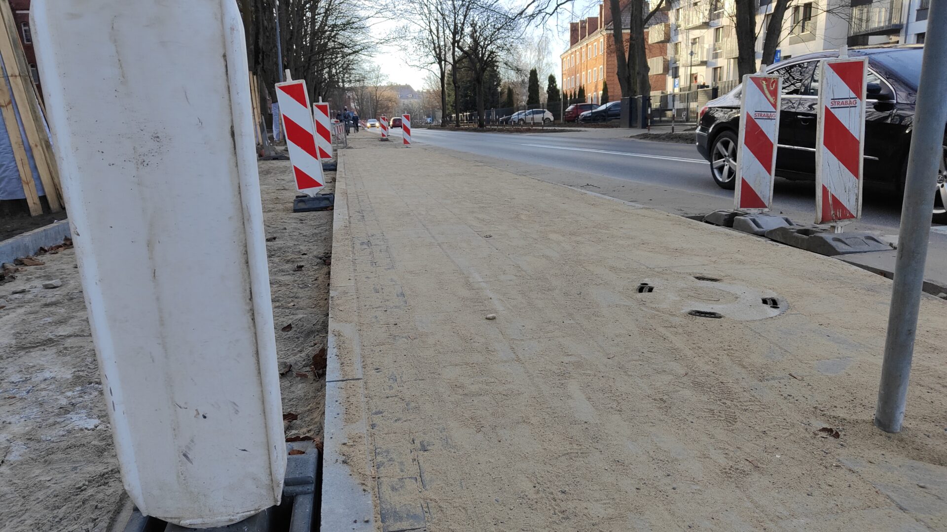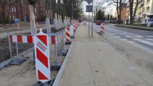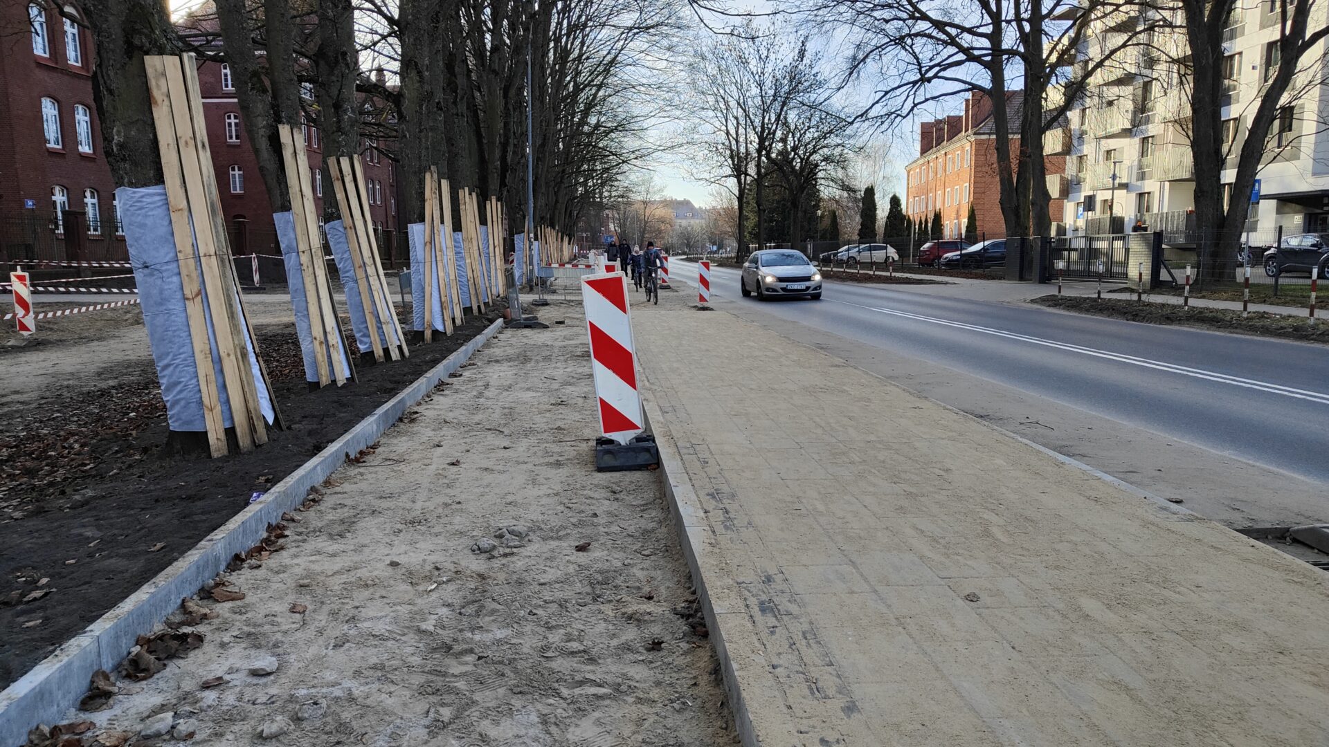Roboty nie obejmują bowiem samej jezdni. W miejscu obecnego chodnika na kolejnych odcinkach systematycznie pojawia się nowy, szerszy, a dodatkowo obok powstaje oddzielna trasa specjalnie dla rowerzystów. Cały odcinek objęty inwestycją liczy 1300 metrów, od skrzyżowania z ul. Jasną aż do ronda przy skrzyżowaniu z ul. Jedności Narodowej. Prace zostały podzielone na 11 etapów. Obecnie w okresie świątecznym, co oczywiste prace zostały wstrzymane. Natomiast tuż przed wigilią najwięcej działo się przy skrzyżowaniu z ulicą Artyleryjską. To tu najmocniej utrudnienia odczuwają piesi, którzy musieli korzystać z tymczasowego przejścia. Obecnie można zaobserwować, że poruszają się już jednak fragmentem nowego chodnika. Cała inwestycja powinna zostać wykonana do kwietnia. W ten sposób zakończy się wieloletnia rywalizacja pieszych i rowerzystów o to, kto ma w tym miejscu pierwszeństwo, a jedna i druga grupa będzie mogła czuć się tu bezpiecznie. Koszt wszystkich prac to 2,8 mln zł.