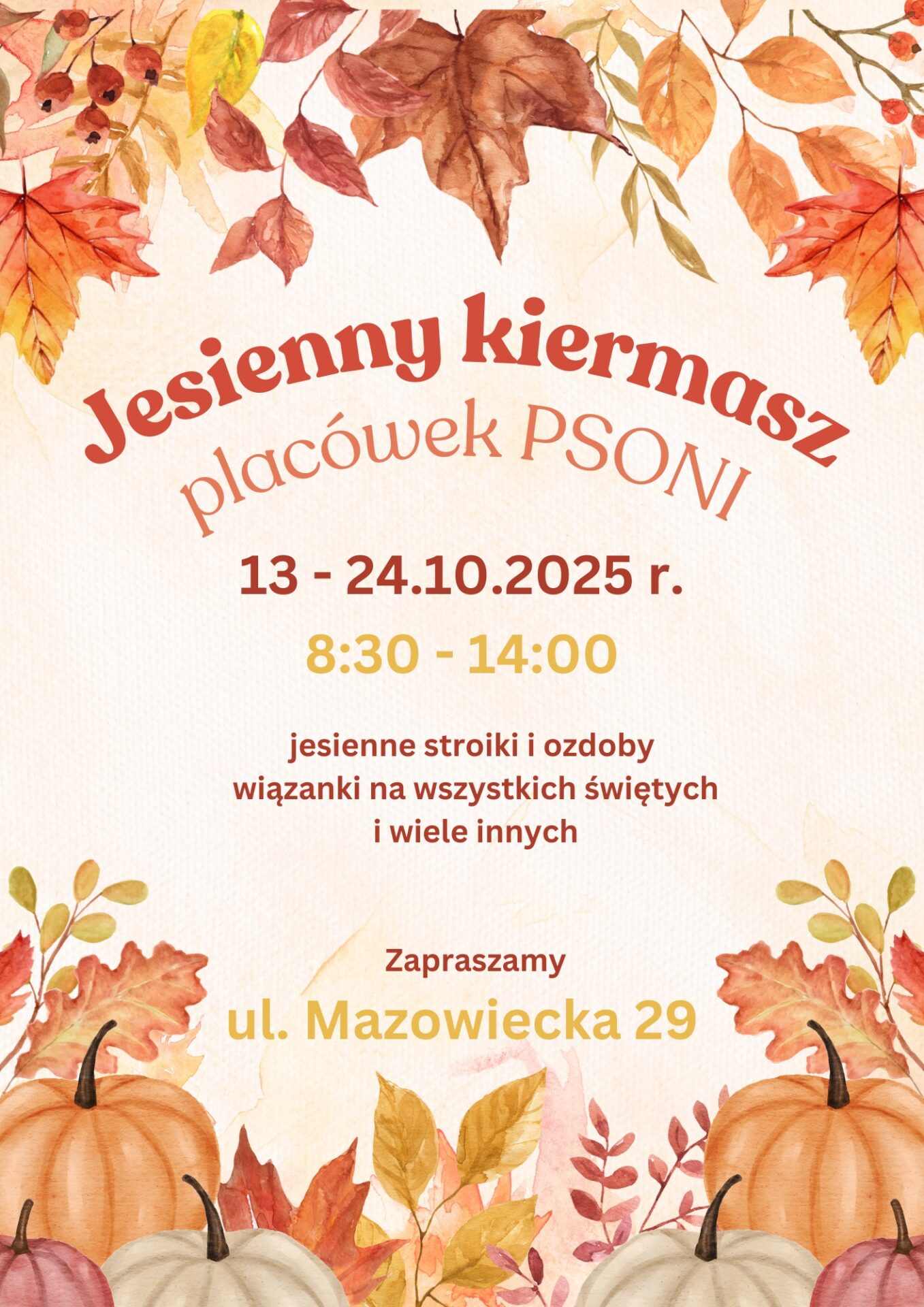 Od 13 do 24 października w godzinach od 8:30 do 14:00 przy ul. Mazowieckiej 29 w Kołobrzegu odbywać się będzie Jesienny Kiermasz Placówek PSONI.
