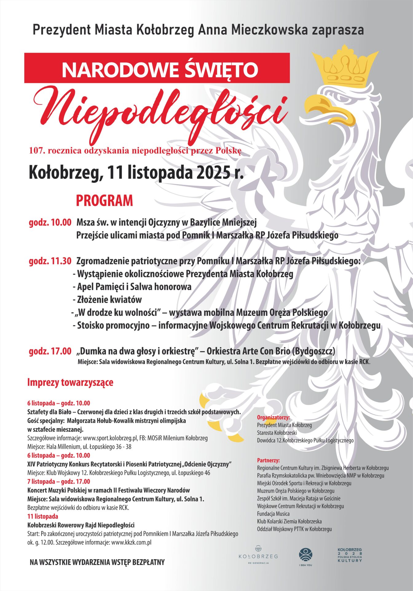 Prezydent Miasta Kołobrzeg Anna Mieczkowska zaprasza mieszkańców oraz gości na uroczyste obchody Narodowego Święta Niepodległości, które odbędą się 11 listopada 2025 roku. W tym roku przypada 107. rocznica odzyskania przez Polskę niepodległości.