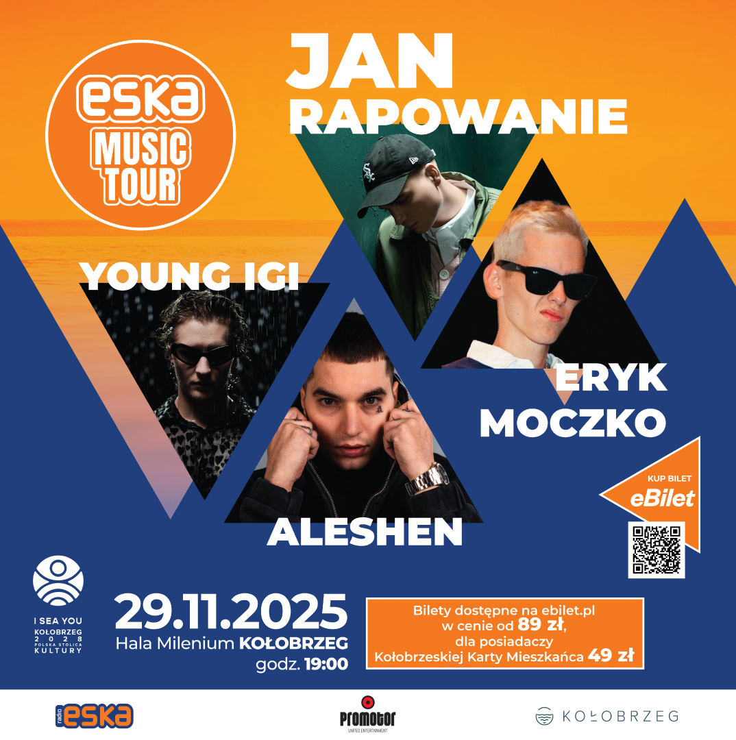 Miasto zaprasza na koncert w ramach ESKA Music Tour. Tym razem popularna stacja radiowa zapewni występ w Kołobrzegu takich artystów, jak: Jan Rapowanie, Young Igi, Eryk Moczko i Aleshen. Bilety są już dostępne na www.ebilet.pl, a dla posiadaczy Kołobrzeskiej Karty Mieszkańca przygotowano promocyjną cenę 49 zł.