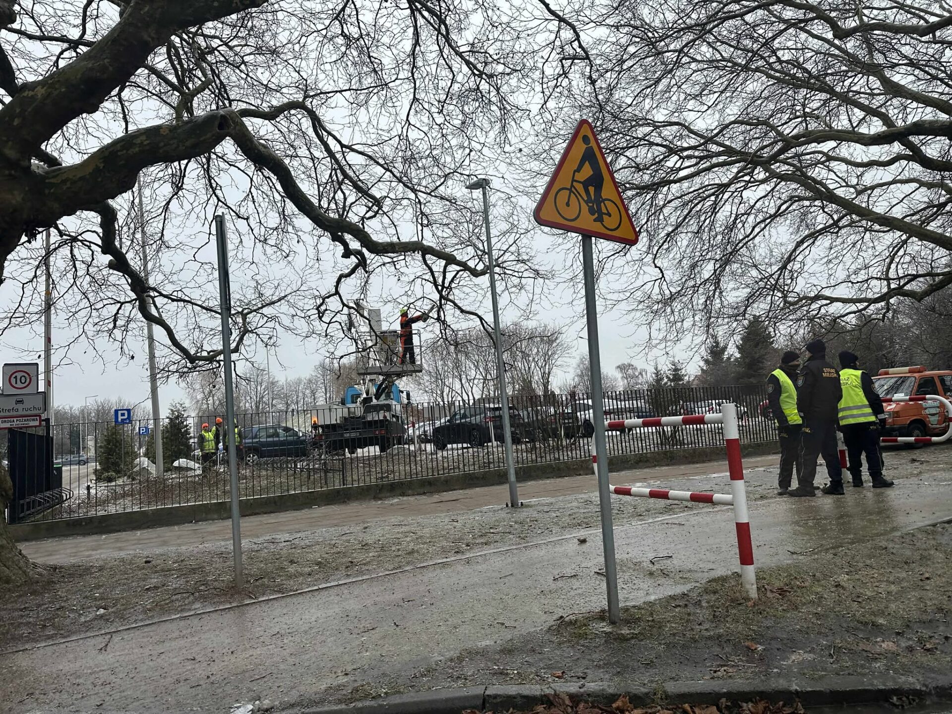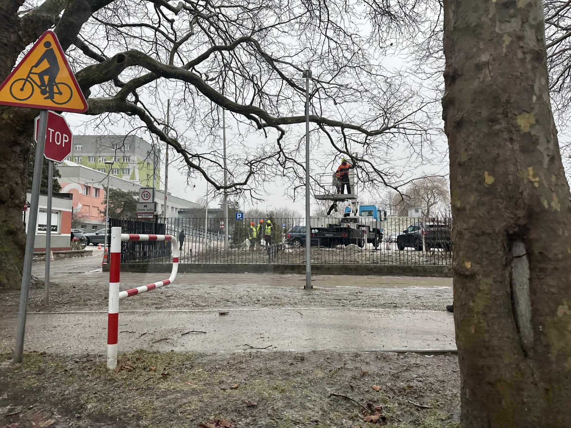 Chodzi o pęknięcia zauważone na pniu. Najbardziej wyraźnie widoczne są na jednym drzewie rosnącym przy bramie wjazdowej na teren Regionalnego Szpitala w Kołobrzegu. Na miejscu przeprowadzono wizję lokalną. Dokumentację zdjęciową przekazano ekspertowi. Według zaleceń arborysty konieczna jest redukcja korony drzewa, która obecnie jest dodatkowo obciążona pokrywą lodową. Przed szpitalem trwają obecnie prace, a przejście chodnikiem zostało zagrodzone. Teren zabezpiecza straż miejska, która dba o bezpieczeństwo pieszych.