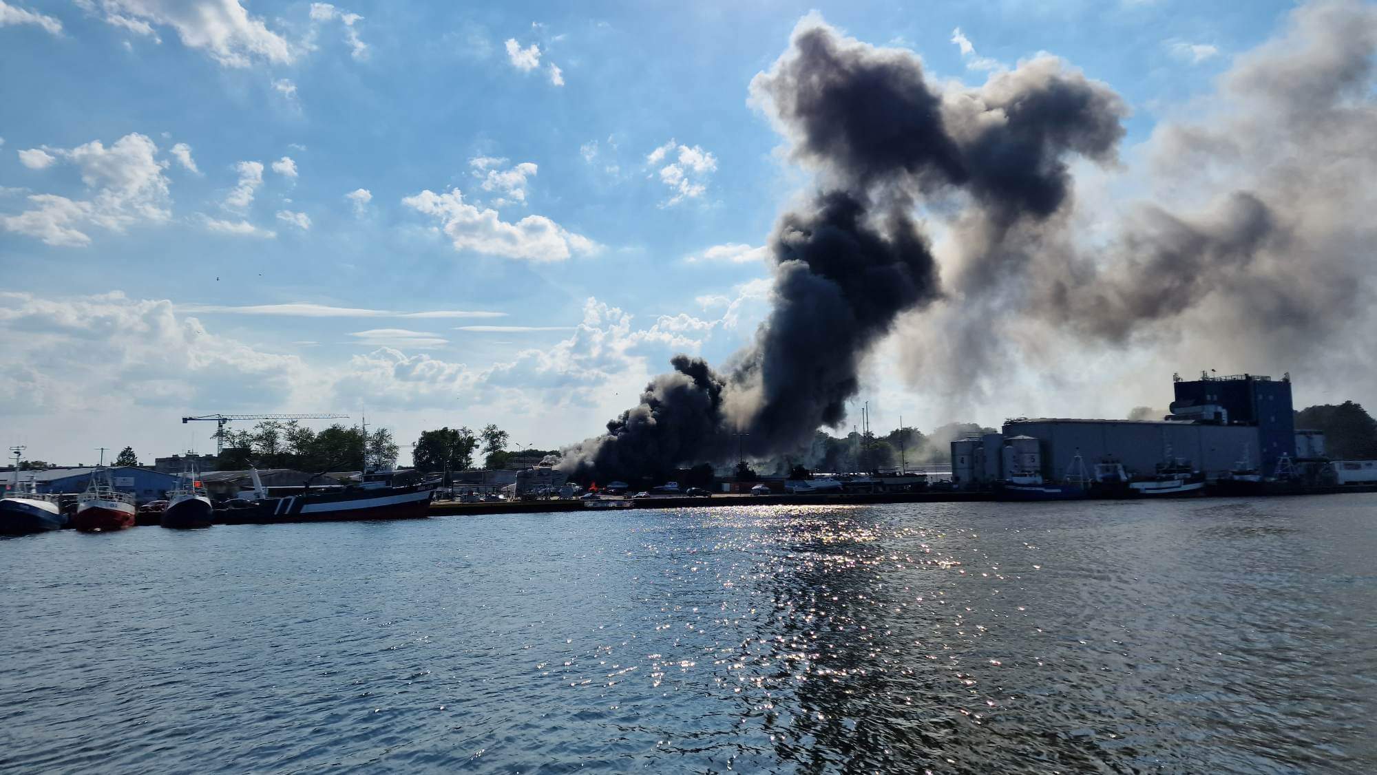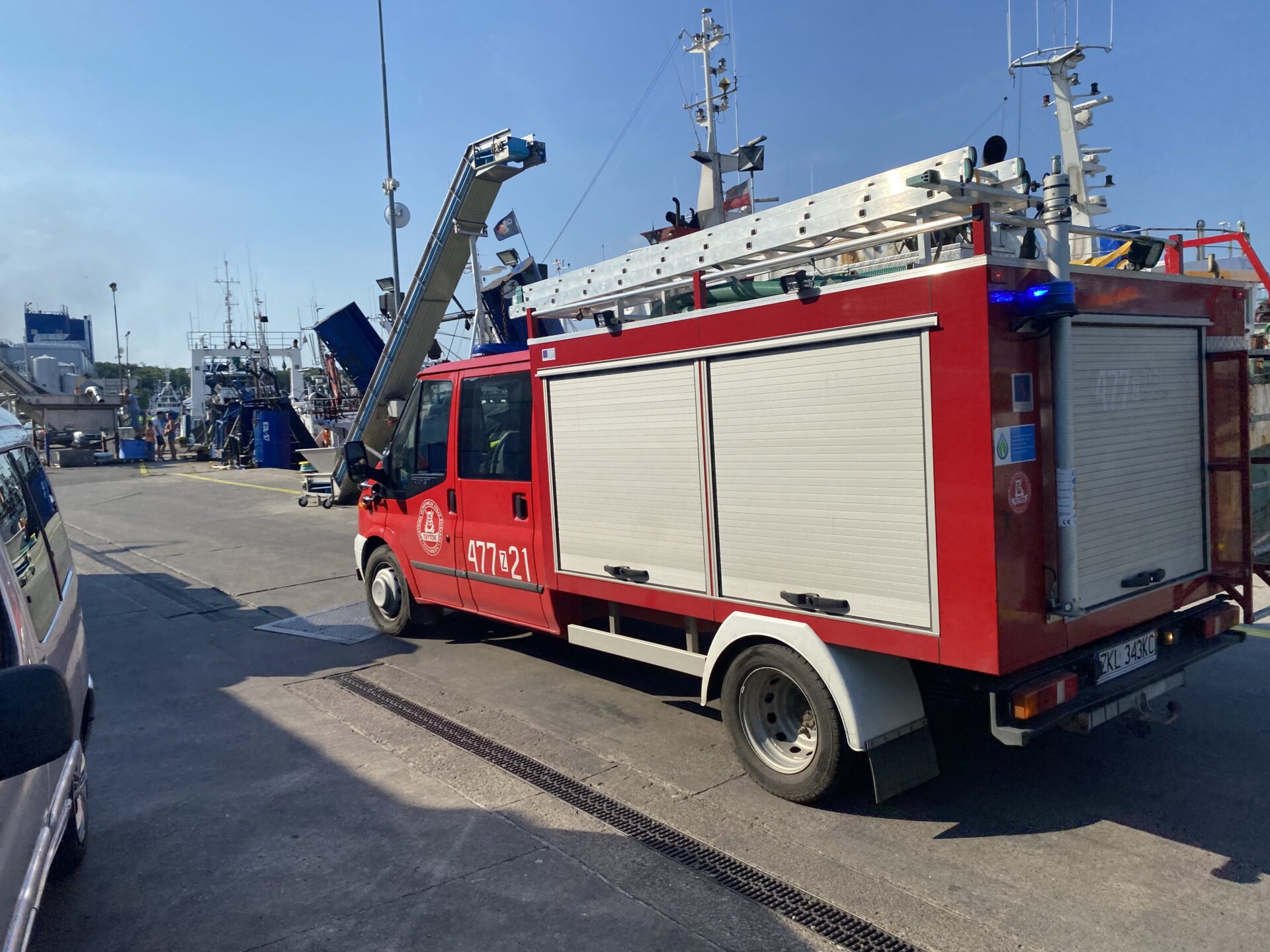 Trwa akcja gaśnicza w kołobrzeskim porcie rybackim.