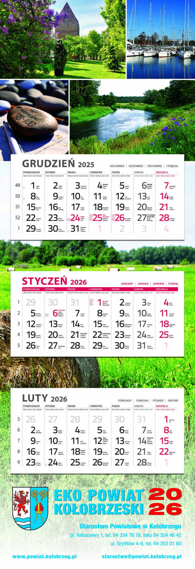 – Jak co roku Starostwo Powiatowe w Kołobrzegu rozdaje kalendarze ścienne promujące Powiat Kołobrzeski dla turystów i mieszkańców naszego powiatu. Akcja ta nieustannie cieszy się ogromnym zainteresowaniem mieszkańców. Gorąco zapraszam do starostwa po odbiór kalendarza – mówi starosta Mirosław Tessikowski.