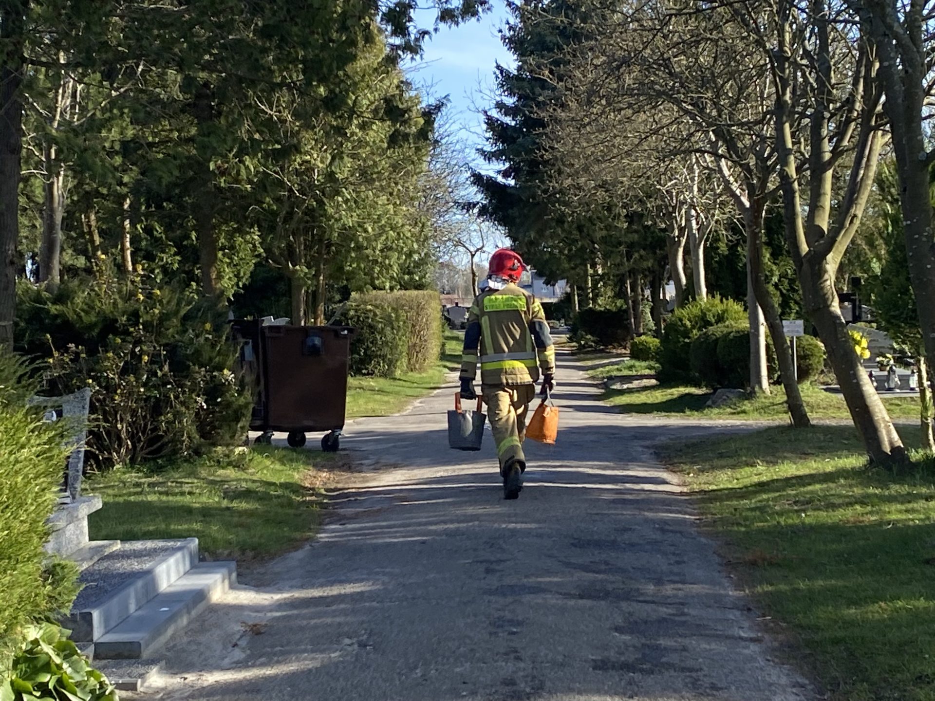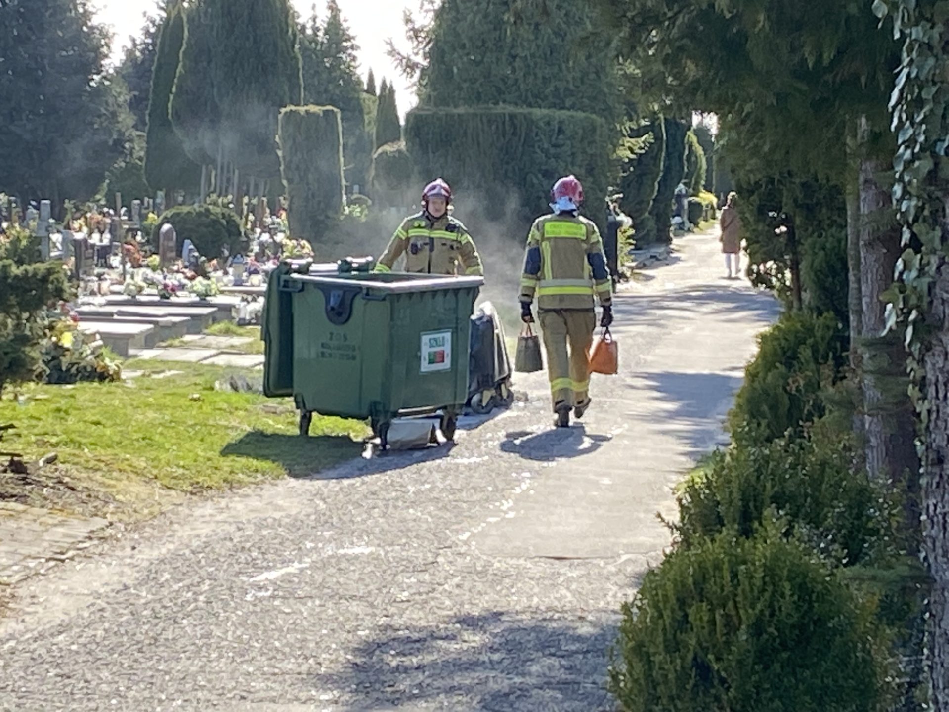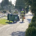 Osoba zgłaszająca zaalarmowała strażaków o zadymieniu na terenie cmentarza. Okazało się, że paliły się odpady w jednym z kontenerów. Strażacy nie mogli wjechać wozem na teren cmentarza, musieli, więc poradzić sobie w inny sposób. Nalewali wodę z jednego z kranów zainstalowanych na terenie cmentarza. Zagrożenie zostało szybko opanowane.