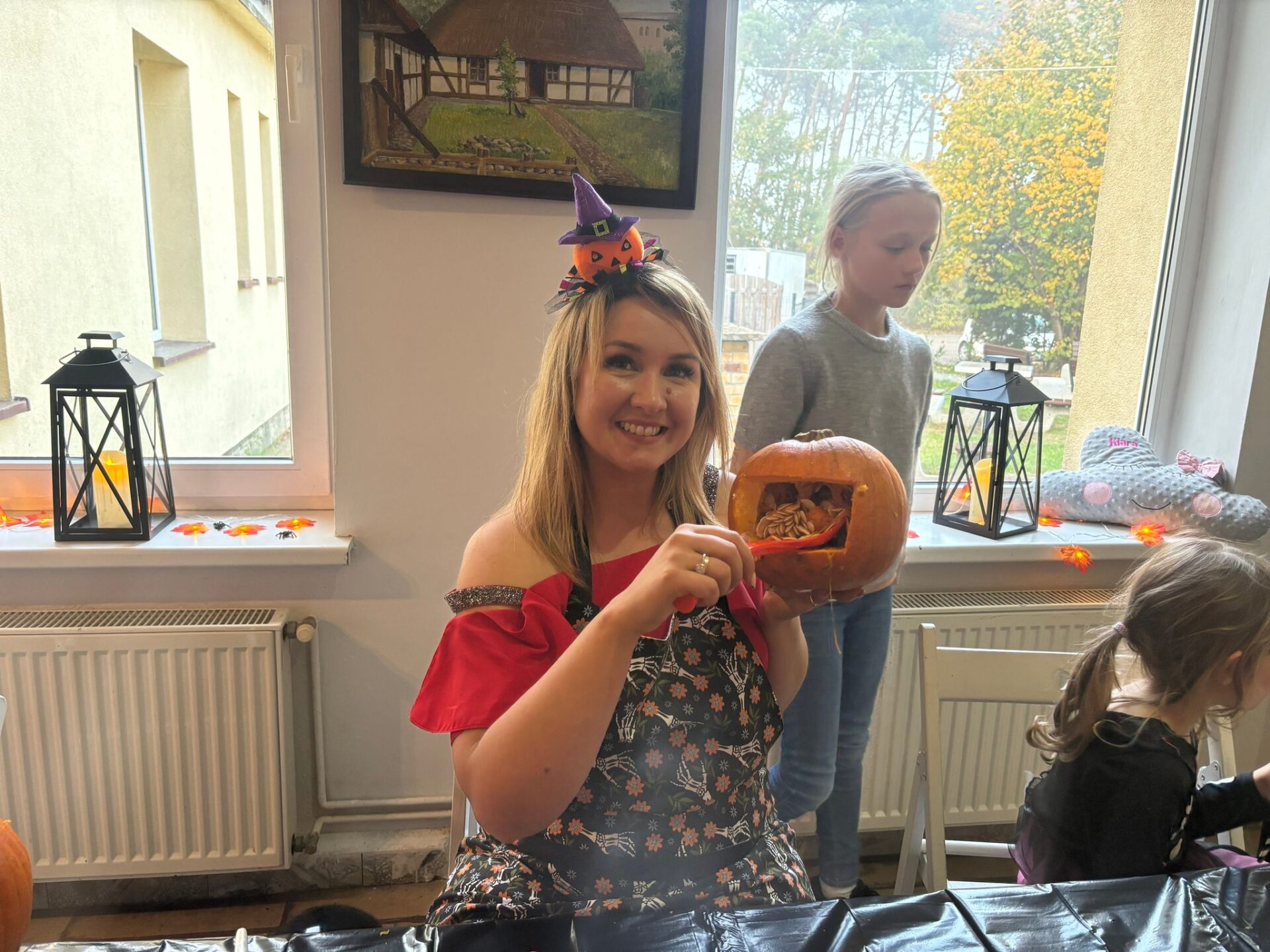 Rzeźbiarze kreatywnie podeszli do zadania wycinając w pomarańczowym warzywie przepiękne lampiony. Artystyczną stroną akcji dowodziła jak zwykle Dorota Waligóra, a w Kotle z zupą dyniową zamaszyście mieszała dyrektorka Gminnego Ośrodka Kultury Sylwia Chyła. – Energię utraconą przy pracy twórczej uzupełnialiśmy pysznościami przyniesionymi przez niezawodne mamy artystów i pyszną zupą dyniową. Radości z wspólnej pracy było co niemiara, a światełka dyniowych lampionów będą oświetlały ogródki i parapety w domach twórców – opowiada pomysłodawczyni dyniowej imprezy Dorota Waligóra.
