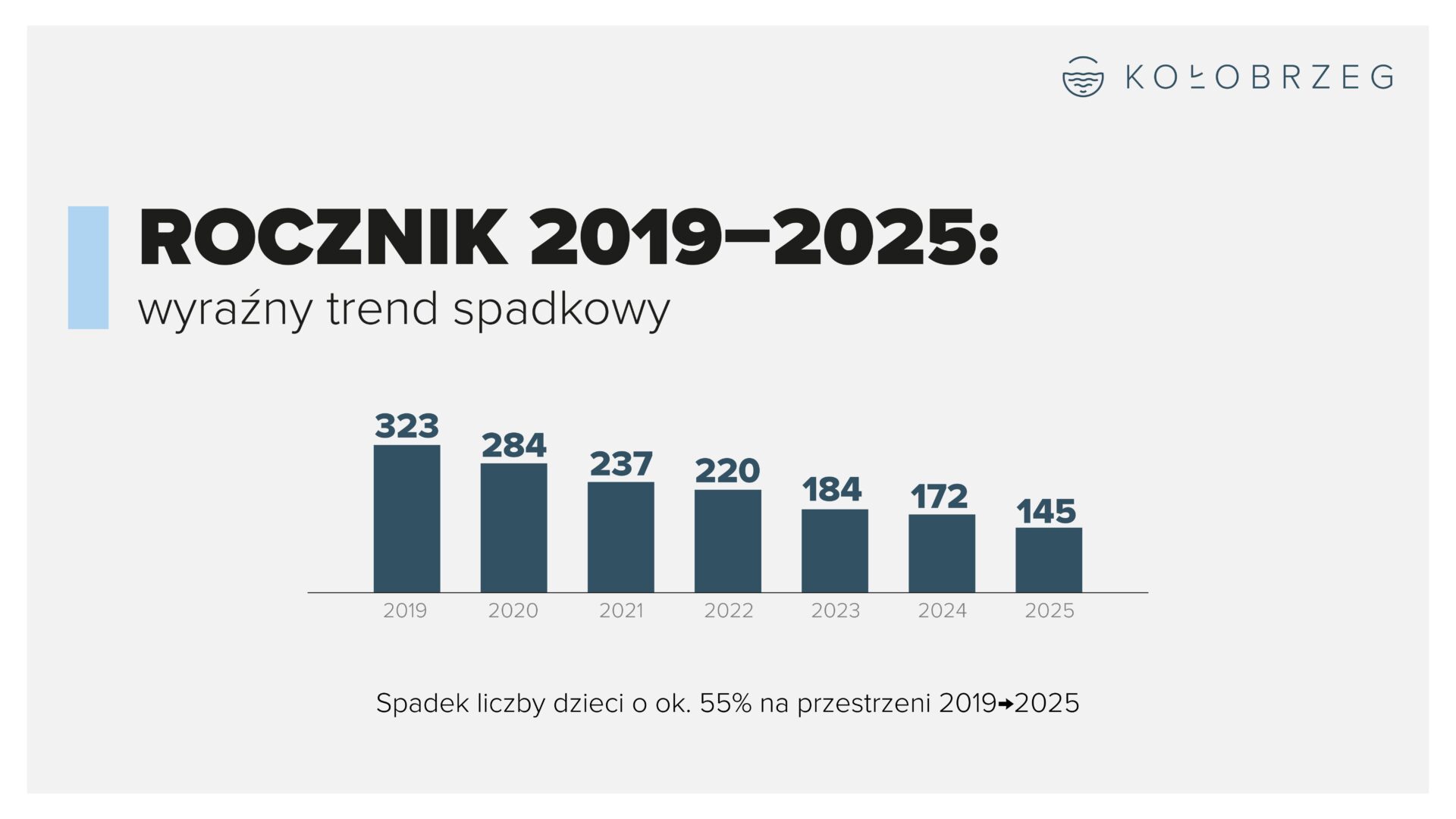 Kołobrzeski magistrat opublikował najnowszą analizę demograficzną, która potwierdza trend widoczny w wielu polskich samorządach – liczba najmłodszych mieszkańców szybko maleje. W ciągu zaledwie sześciu lat liczba urodzeń spadła z 323 w 2019 roku do 145 w 2025 roku. Oznacza to ponad 55-procentowy spadek.