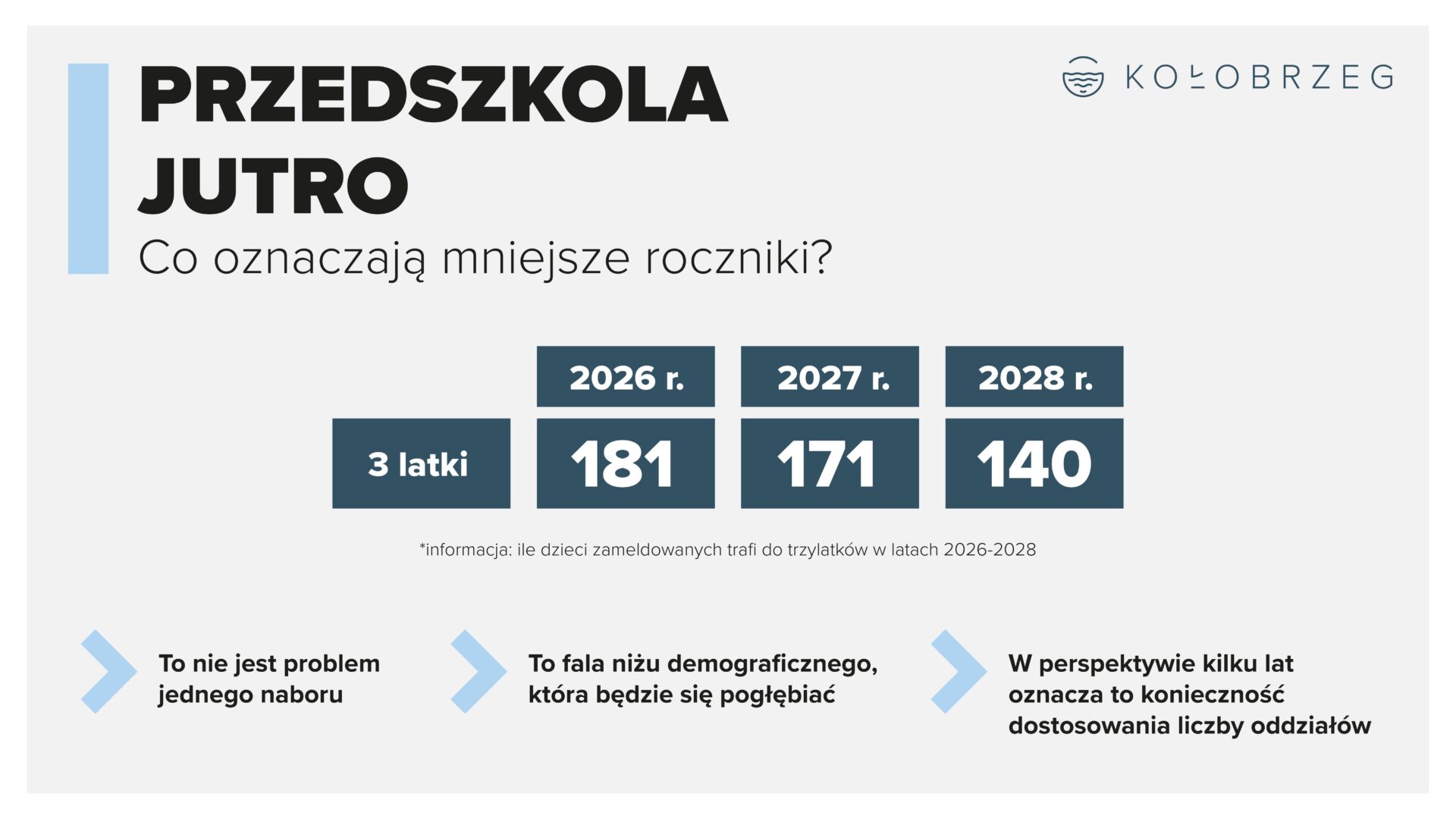Według prognoz tendencja nie tylko się utrzyma, ale będzie się pogłębiać. W kolejnych latach liczba dzieci w rocznikach przedszkolnych ma wynosić: 181 w 2026 roku, 171 w 2027 oraz 140 w 2028 roku. To wartości znacząco niższe niż jeszcze kilka lat temu i mające bezpośrednie przełożenie na funkcjonowanie miejskiej oświaty.