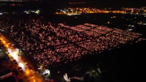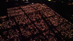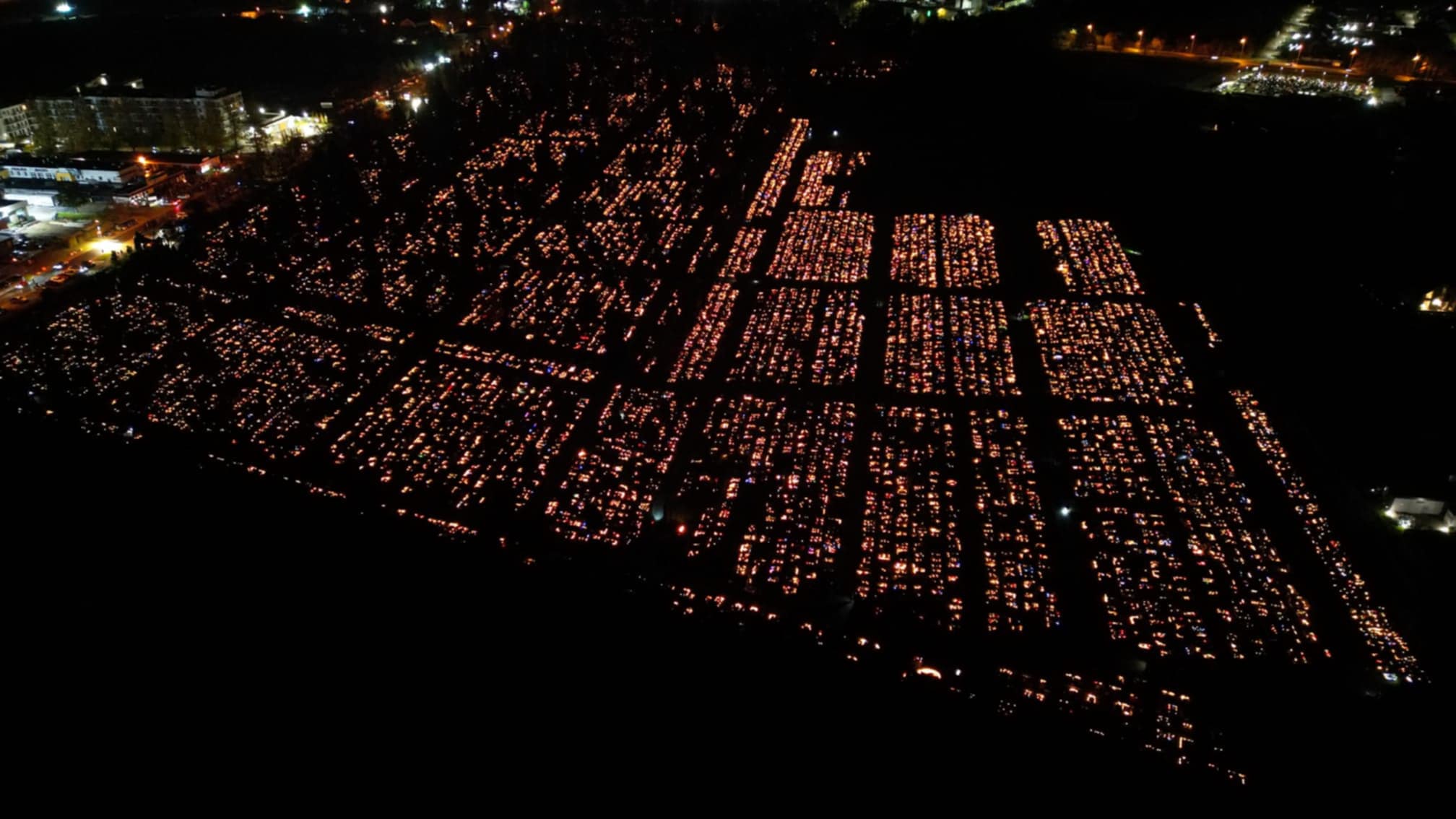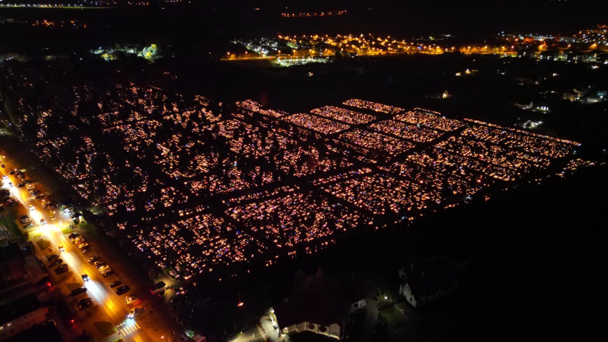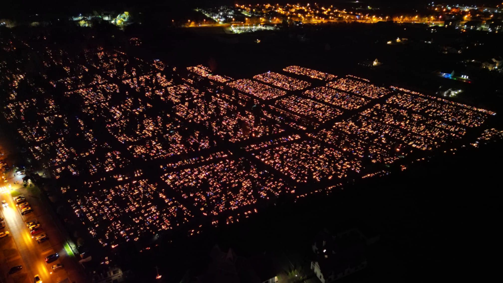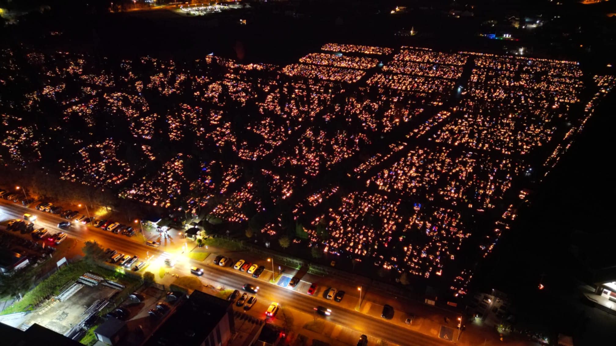 Zdjęcia z drona ukazują kołobrzeski cmentarz nocą – rozświetlony tysiącami świateł, będących symbolem pamięci i szacunku. To chwila refleksji nad przemijaniem oraz znaczeniem tradycji, która łączy pokolenia.