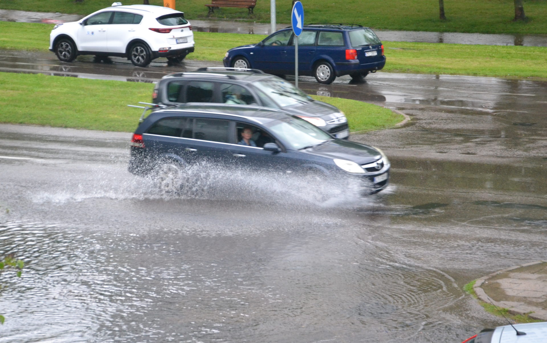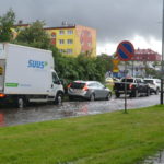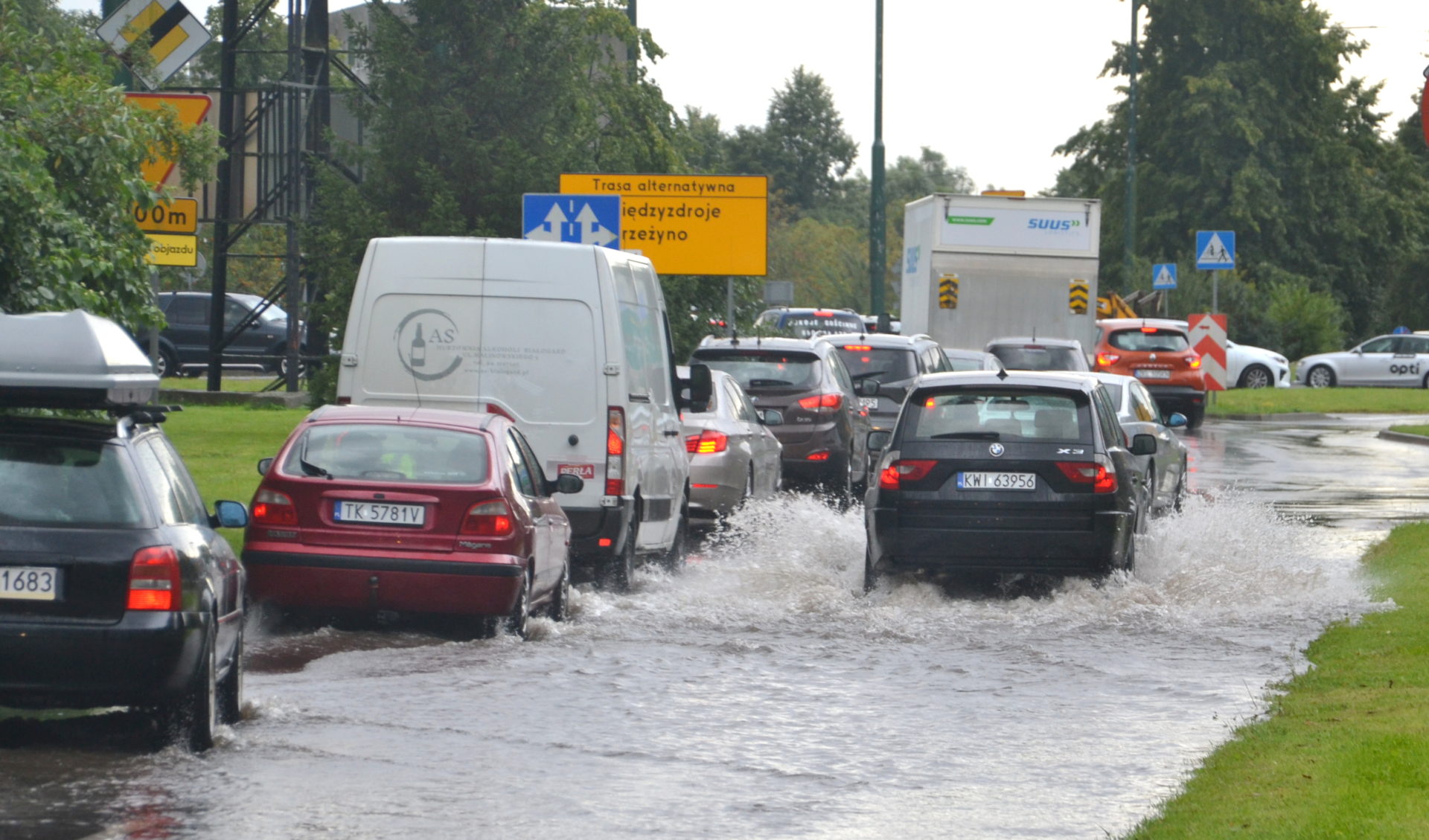 Tym razem mocno popadało po godzinie 13. Wystarczyło kilka minut, by ulica Myśliwska stanęła. Woda na jednym z pasów jezdni była na tyle wysoka, że tylko nieliczni kierowcy decydowali się na przejazd. Większość stała w kolejce i zjeżdżała na lewy pas prowadzący w stronę ronda Solidarności.