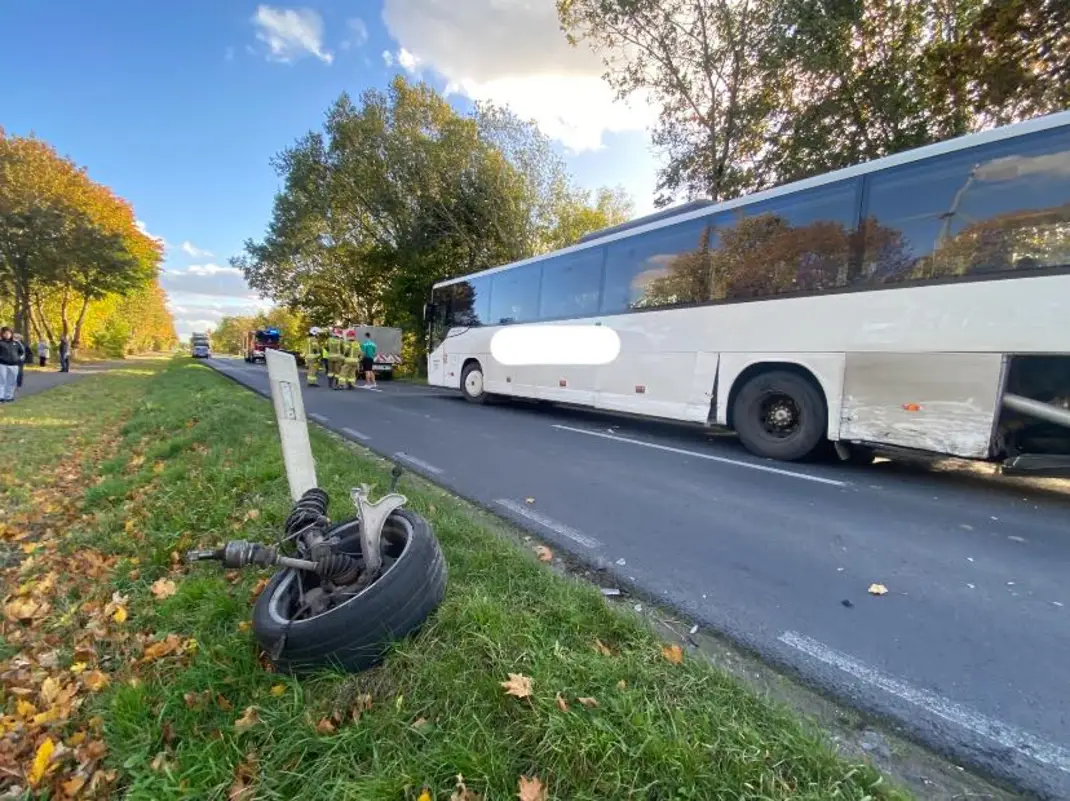 Do zdarzenia doszło około godziny 16. Autobus przewożący pasażerów, samochód dostawczy i osobowy zderzyły się na wysokości miejscowości Jarogniew, niedaleko Gościna. Osobówka nie nadawała sie do dalszej jazdy. W wyniku kolizji pojazd stracił koło. Pojazdy zabezpieczyli strażacy. Na szczęście w wyniku zdarzenia nikt nie odniósł poważnych obrażeń.