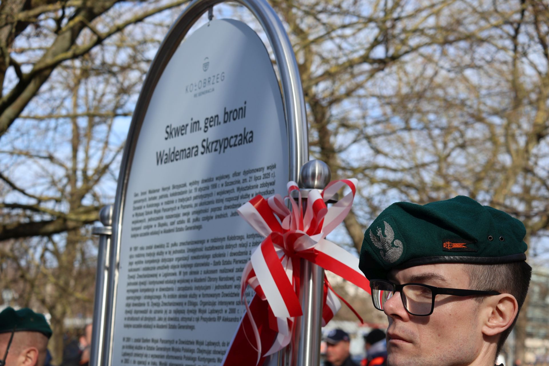 Od kilku dni na miejscu można było zauważyć już oznakowanie wskazujące nazwę skweru. Dziś oficjalnie odsłonięta została także pamiątkowa tablica przedstawiająca postać generała, czyli „żołnierza z krwi i kości”, co podkreślali uczestnicy uroczystości. Jednym z zaproszonych gości był minister, koordynator służb specjalnych Tomasz Siemoniak: – Zawsze mogłem być pewien jego uczciwości, bezkompromisowości i patrzenia na dobro żołnierza – wspominał generała ze wspólnej pracy w Ministerstwie Obrony Narodowej. Z kolei prezydent Anna Mieczkowska podkreślała, że Waldemar Skrzypczak był i będzie na stałe związany z Kołobrzegiem. W czasie uroczystości nie mogło zabraknąć także rodziny i przedstawicieli środowiska wojskowego, inicjatorów uhonorowania generała. Żona Waldemara Skrzypczaka dziękowała radnym i wszystkim, którzy przyczynili się do upamiętnienia generała.